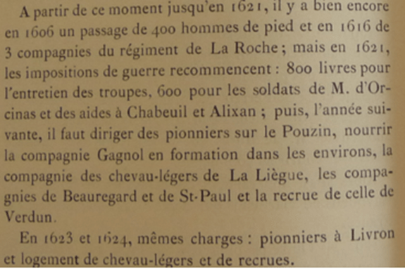 A cette période il est demandé aux habitants de loger une compagnie de chevau-légers du régiment du Marquis de Malespine et de fournir logis et vivres durant deux jours :