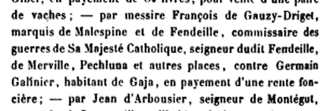 Mon aïeul doit payer « pour la dépense de ‘’deux cheval’’ de Monsieur le marquis de Malespine pour un jour » (Aide à la transcription Roger Colin de Egda) [4]