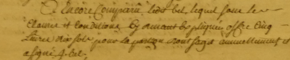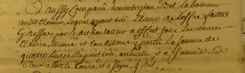 « Que personne n’a voulu sur enchérir sur l’offre faite par ledit Jean Bel, ledit Bit consul nous requiat luy adjuger le dit appensionnement aquel effet icelliy du s’obliger de payer ladite pension de cinq livres six sols annuellement payable à commencer à ladite Toussaint de l’année prochaine 1746… ».[4]