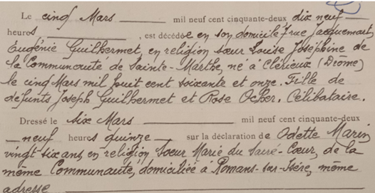 Sœur Louise Joséphine revenue à Romans sur Isère, y décède le 05 mars 1952 [16]: