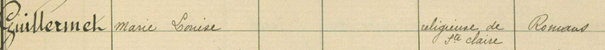 Marie Louise Guillermet nait le 27 octobre 1875 comme toute la fratrie au quartier Baude de Clérieux. A l’âge de 20 ans, vivant chez ses parents, son prénom est sur le recensement de l’année 1896, en tant que cultivatrice.[1] A celui de l’année 1901 elle a quitté le foyer familial.[2]