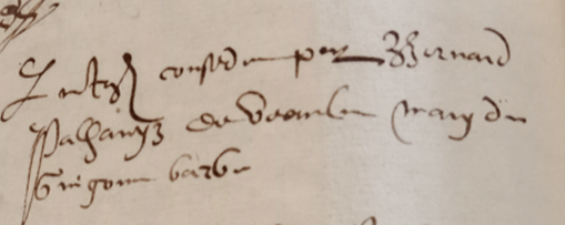 Le plus ancien document connu des actes notariés est une quittance au nom de Palhareys Bernard en date du 02 février 1588 : (4)