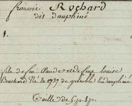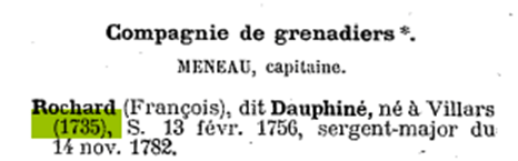 Il est écrit que François Rochard, né le 10/08/1737, sans indication du lieu, est soldat le 03/02/1755, caporal le 06/10/1766, sergent le 05/10/1768, sergent major le 26/06/1781, vétéran le 29/07/1780, sous-lieutenant le 12/01/1792, lieutenant le 12/05/1792.