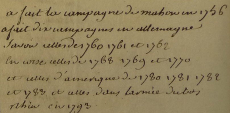 Pour retrouver sa fiche militaire et également son lieu de naissance je pars d’une indication de ses états de service : il a fait la campagne d’Amérique de 1780, 1781, 1782 et 1783.