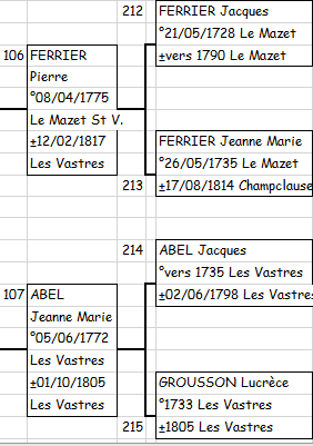 [1] Marie Anne Gential, noté sur l’acte de décès de Pierre Ferrier le 10/02/1817, les Vastres 6 E 282/2, vue 200/334, AD43 (j’ai recherché le mariage de Pierre et Marie Anne : je ne l’ai pas encore trouvé)