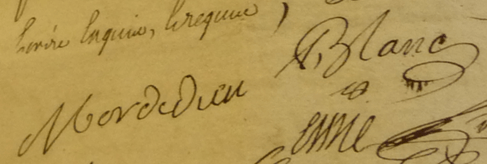 Sur leur contrat de mariage [6] un des témoins, Jean François Blanc est drapier *, l’autre Antoine Perrier est cardeur de laine. Ils signent, ainsi que le père du marié, le document :